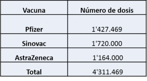 Con este lote de dosis Pfizer, el país ha recibido un total de 4’311.469 de dosis de tres farmacéuticas, distribuidas de la siguiente manera:
