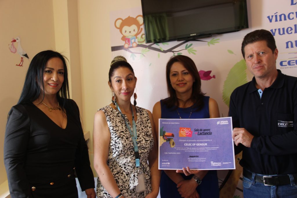 Como parte de la agenda en territorio, Aguinaga entregó la certificación como Instituciones “Amigas de la Lactancia Materna” a Corporación Eléctrica del Ecuador (CELEC EP Gensur) y Fundación de Apoyo Social y Comunitario del Ecuador (FACES) por haber adaptado un espacio para que las funcionarias en período de lactancia puedan amamantar o extraer su leche materna y conservarla adecuadamente.