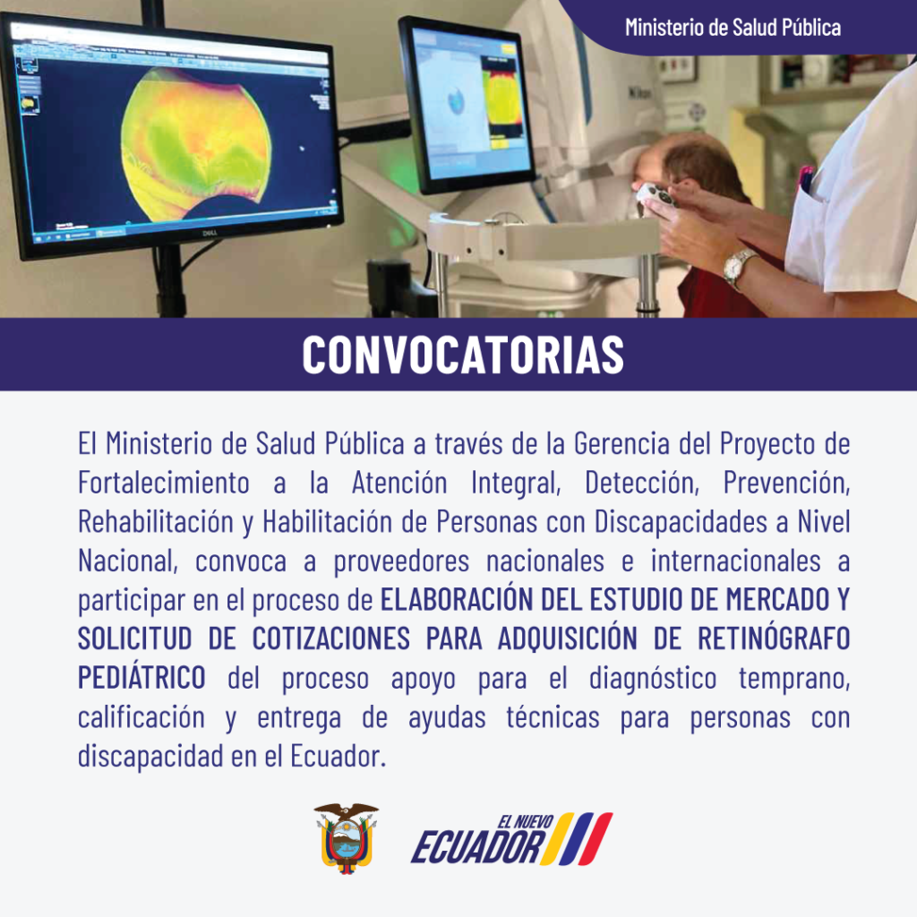 Ministerio de Salud Pública > Sin categoría > Adquisición de RETINÓGRAFO PEDIÁTRICO del proceso Apoyo para el diagnóstico temprano, calificación y entrega de ayudas técnicas para personas con discapacidad en el Ecuador.