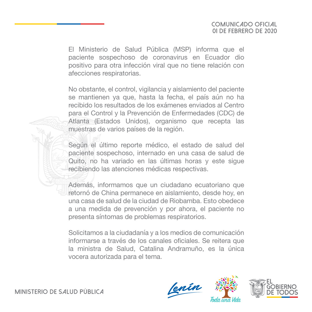 > COMUNICADO OFICIAL| MSP informa que el paciente sospechoso de coronavirus en Ecuador dio positivo para otra infección viral.
