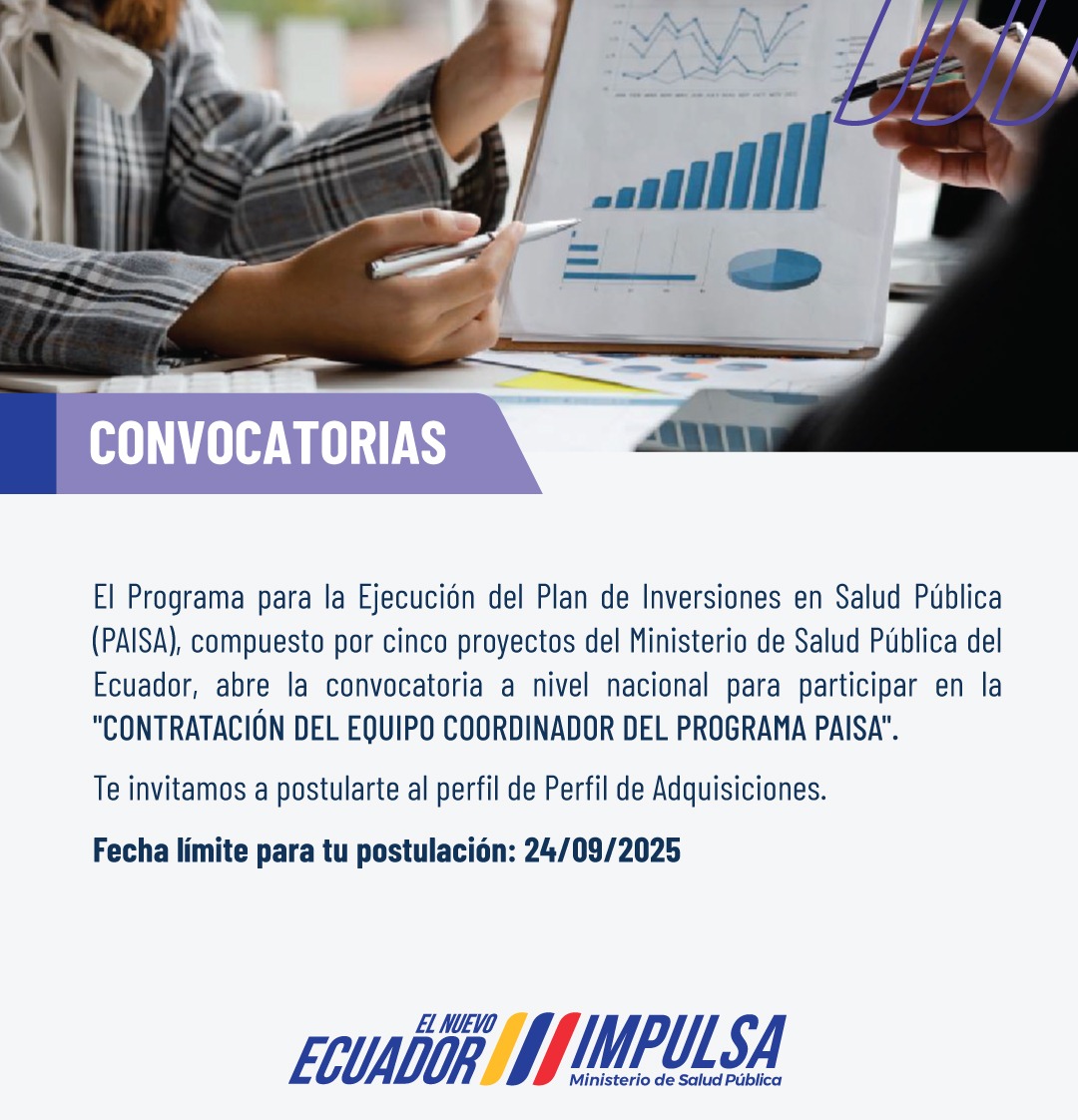 Convocatoria > CONTRATACIÓN DE UN CONSULTOR EXTERNO ESPECIALISTA EN ADQUISICIONES QUE FORMA PARTE DE LA UNIDAD EJECUTORA (UEP) DEL PROGRAMA DE LOS PROYECTOS FINANCIADOS POR LA CAF PARA LA EJECUCIÓN DEL PLAN DE INVERSIONES DE SALUD PÚBLICA PAISA.