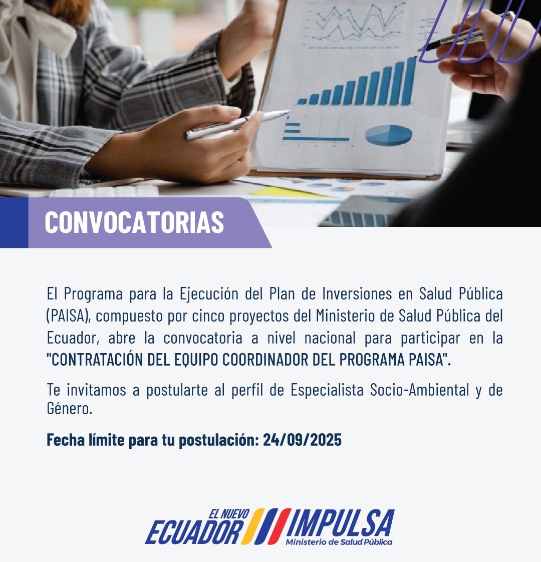 Convocatoria > CONTRATACIÓN DE UN CONSULTOR EXTERNO ESPECIALISTA SOCIO AMBIENTAL Y DE GÉNERO QUE FORMA PARTE DE LA UNIDAD EJECUTORA (UEP) DEL PROGRAMA DE LOS PROYECTOS FINANCIADOS POR LA CAF PARA LA EJECUCIÓN DEL PLAN DE INVERSIONES DE SALUD PÚBLICA PAISA.