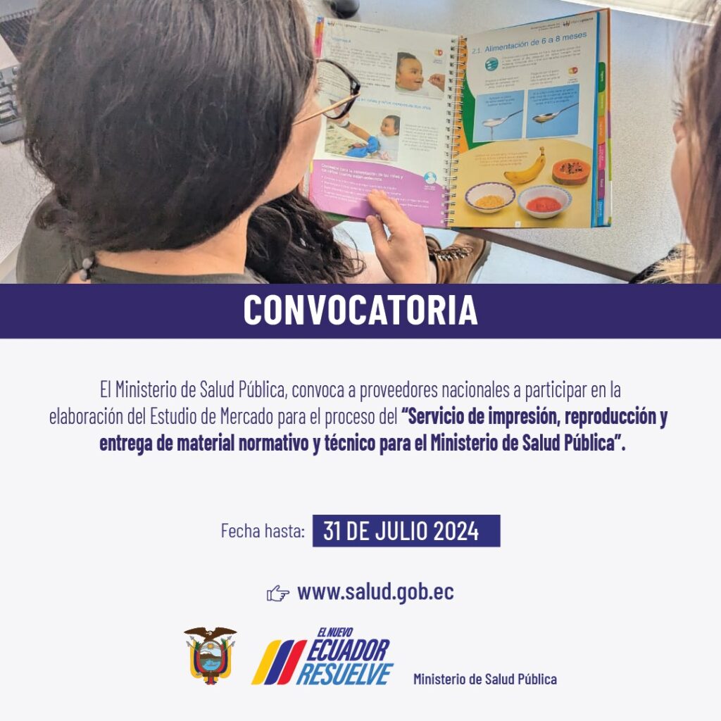 Sin categoría > Convocatoria a proveedores nacionales a participar en el proceso de elaboración del Estudio de Mercado para la contratación del “SERVICIO DE IMPRESIÓN, REPRODUCCIÓN Y ENTREGA DE MATERIAL NORMATIVO Y TÉCNICO PARA EL MINISTERIO DE SALUD PÚBLICA”.