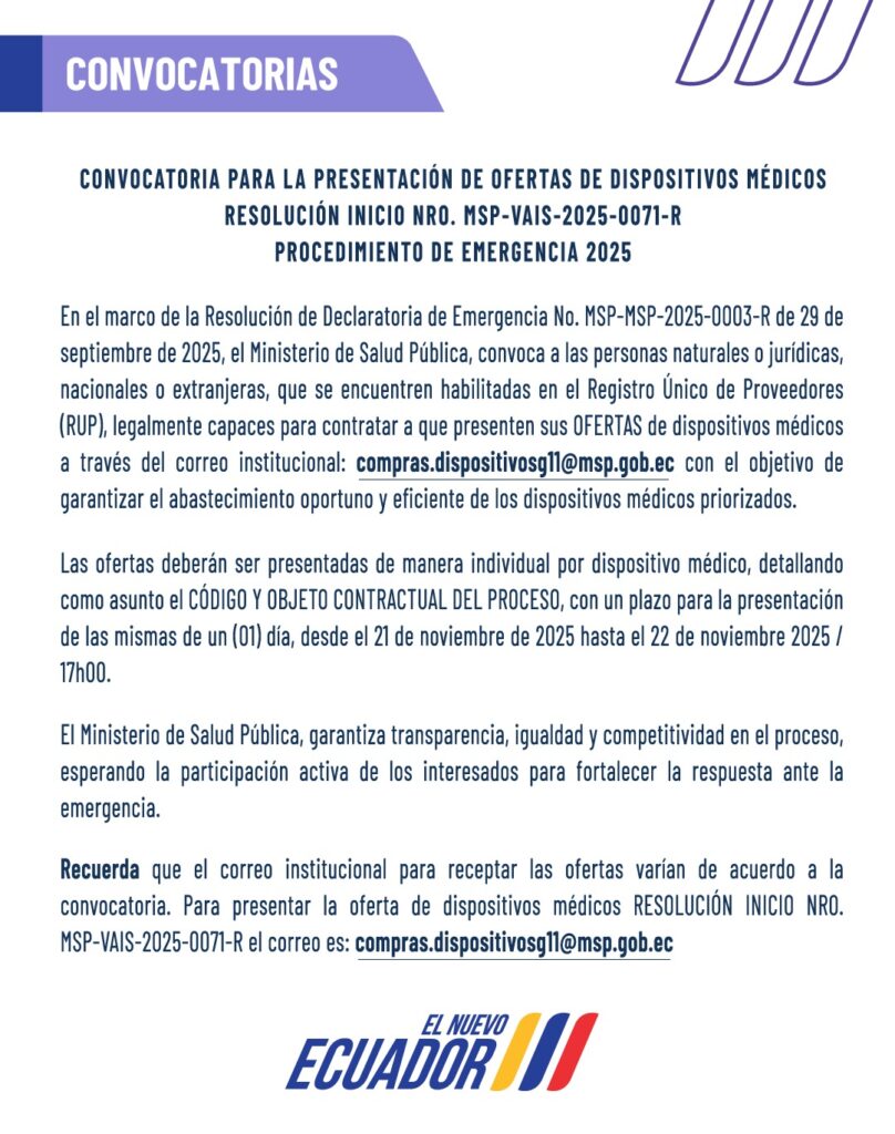 CONVOCATORIA PARA LA PRESENTACIÓN DE OFERTAS DE DISPOSITIVOS MÉDICOS RESOLUCIÓN INICIO NRO. MSP-VAIS-2025-0071-R PROCEDIMIENTO DE EMERGENCIA 2025