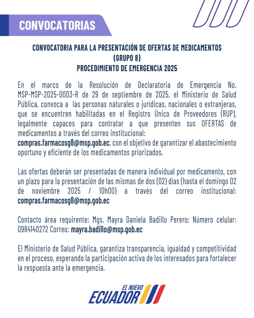 CONVOCATORIA PARA LA PRESENTACIÓN DE OFERTAS DE MEDICAMENTOS (Grupo 8). PROCEDIMIENTO DE EMERGENCIA 2025.