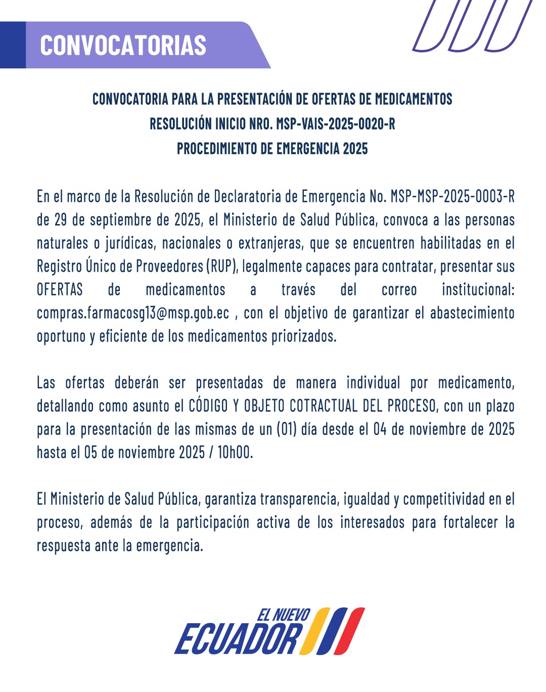 CONVOCATORIA PARA LA PRESENTACIÓN DE OFERTAS DE MEDICAMENTOS RESOLUCIÓN INICIO NRO. MSP-VAIS-2025-0020-R. PROCEDIMIENTO DE EMERGENCIA 2025.