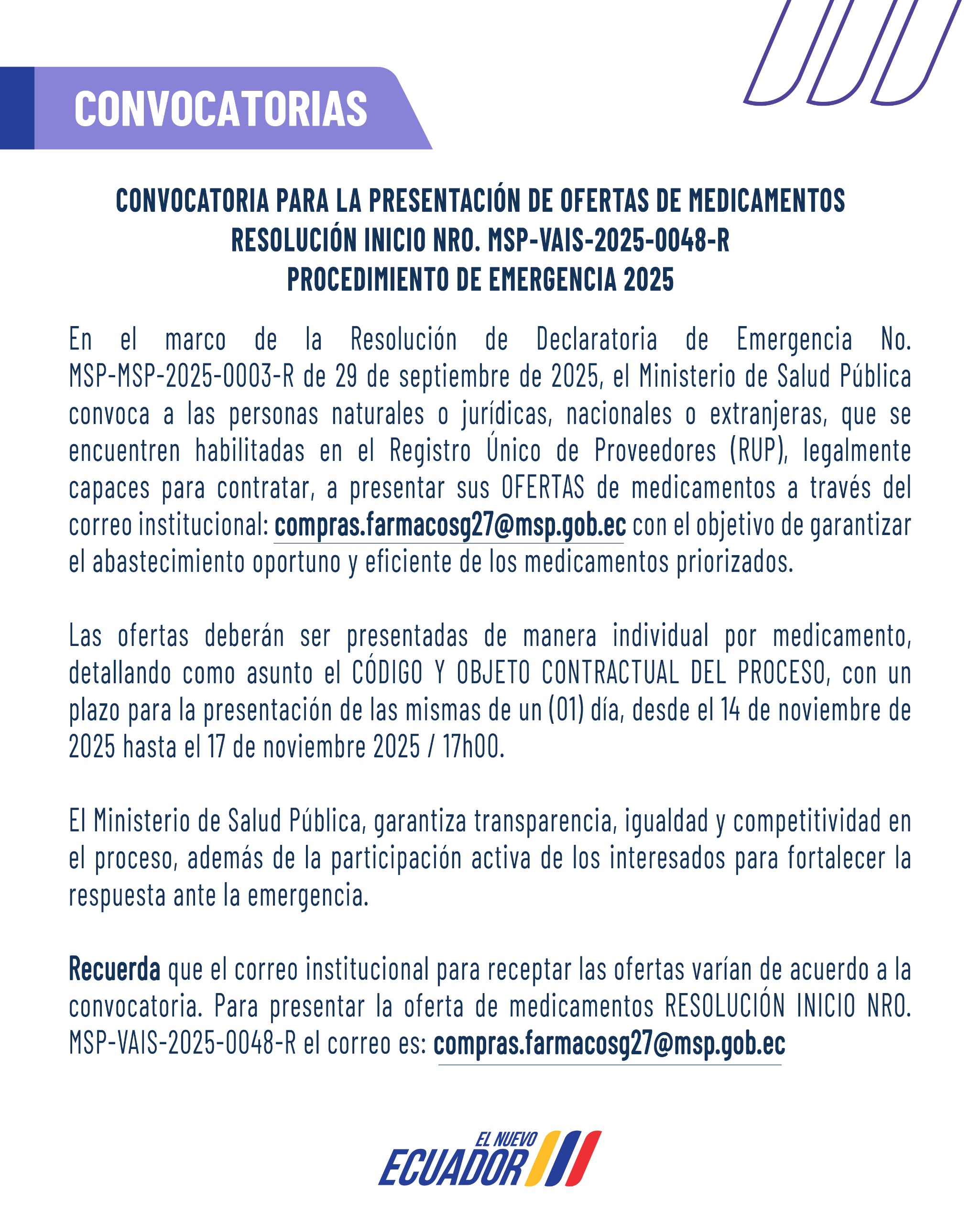 CONVOCATORIA PARA LA PRESENTACIÓN DE OFERTAS DE MEDICAMENTOS RESOLUCIÓN INICIO NRO. MSP-VAIS-2025-0048-R. PROCEDIMIENTO DE EMERGENCIA 2025.