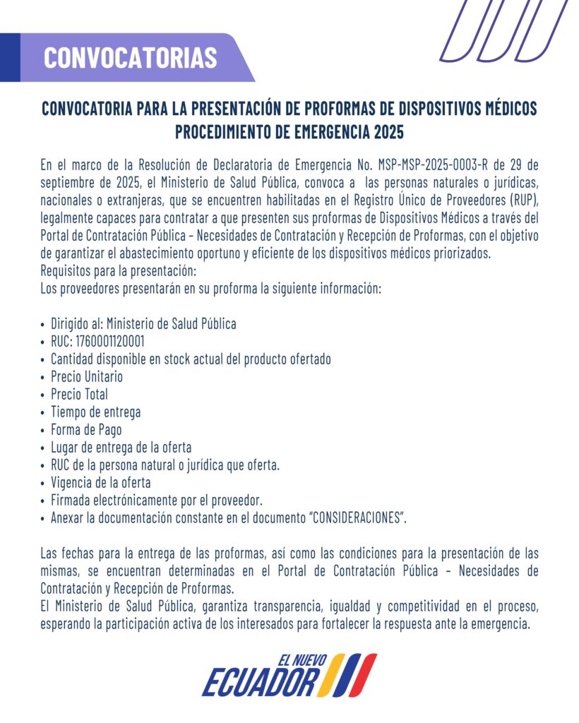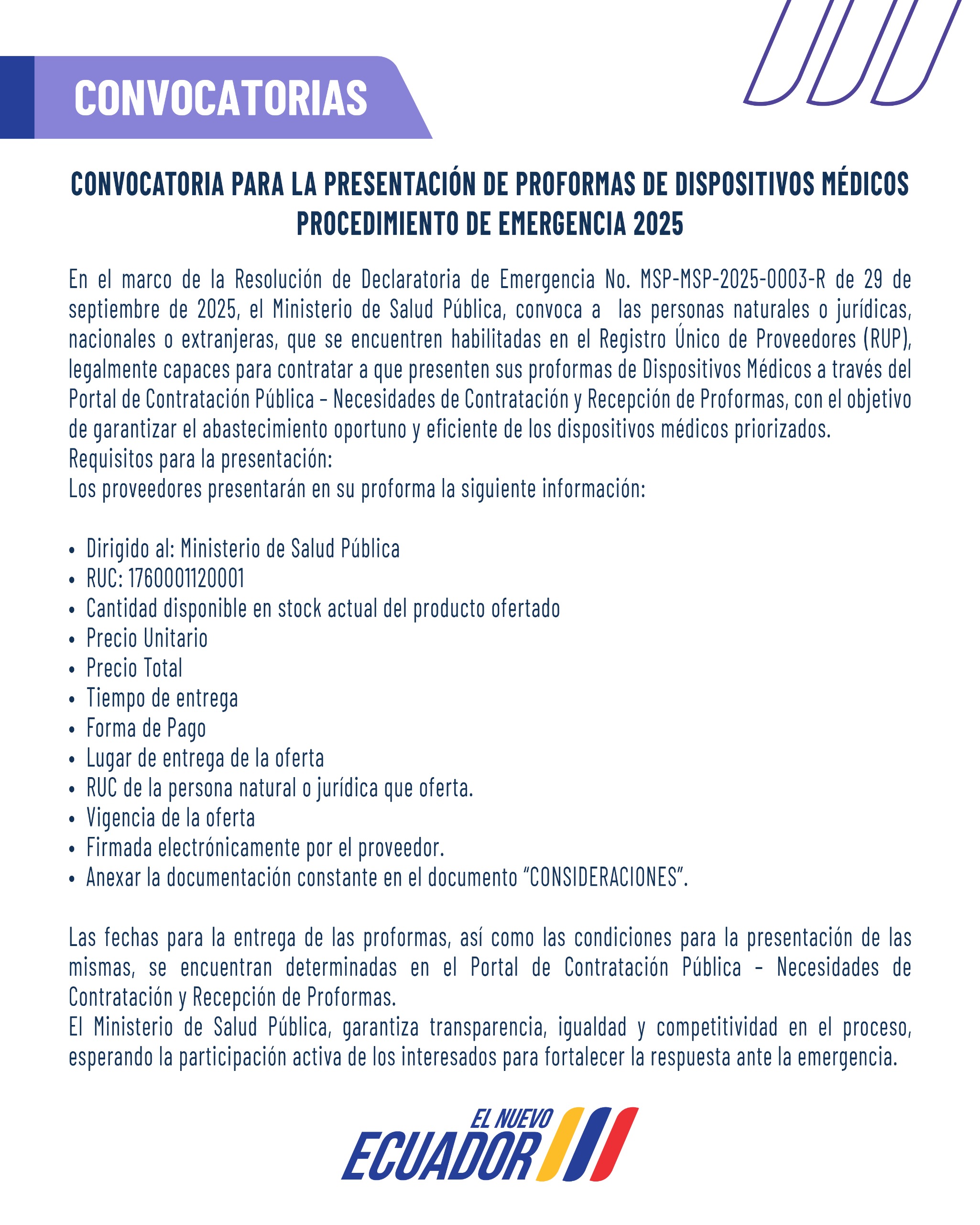 > CONVOCATORIA PARA LA PRESENTACIÓN DE PROFORMAS DE DISPOSITIVOS MÉDICOS. PROCEDIMIENTO DE EMERGENCIA 2025