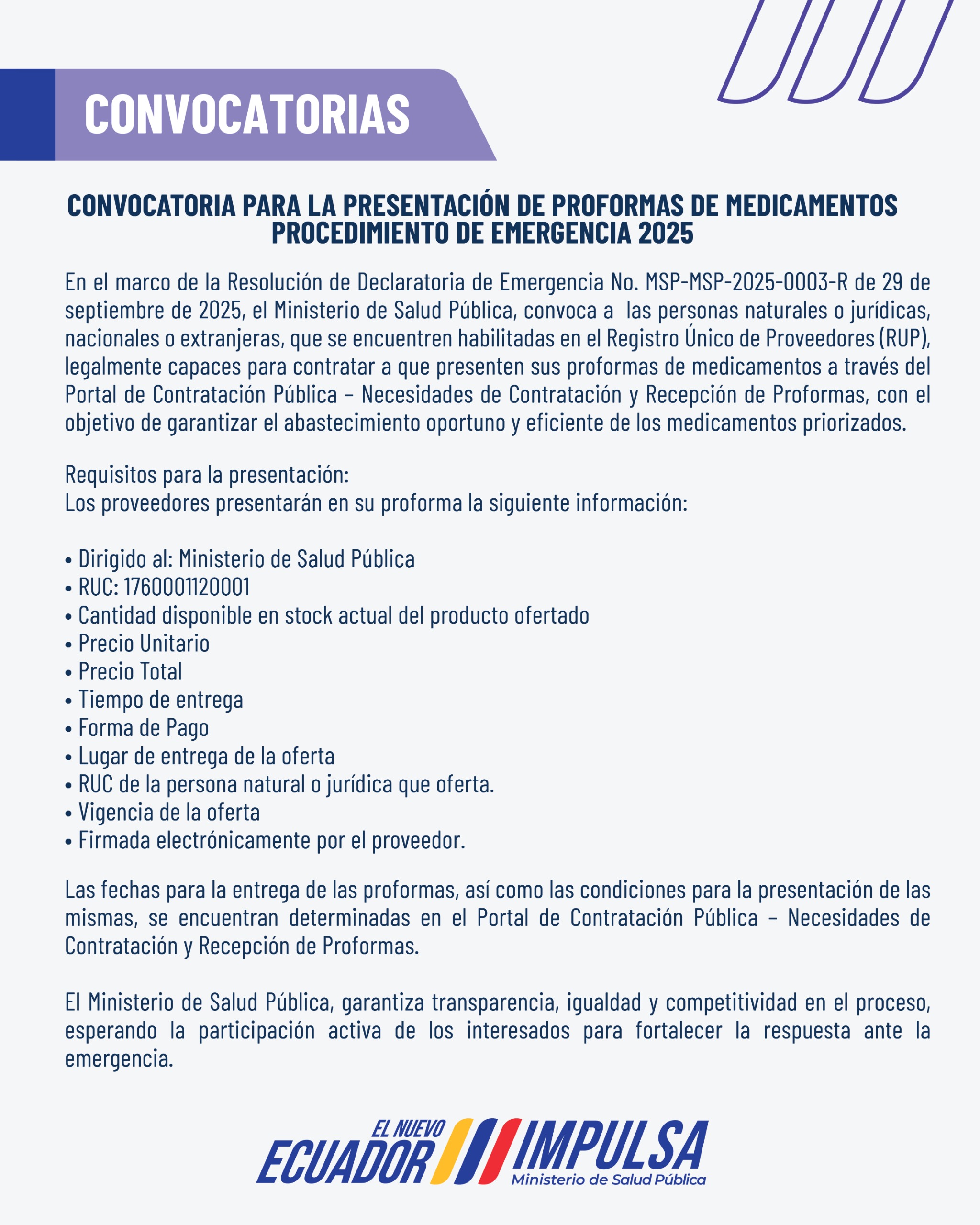 > CONVOCATORIA PARA LA PRESENTACIÓN DE PROFORMAS DE MEDICAMENTOS. PROCEDIMIENTO DE EMERGENCIA 2025.