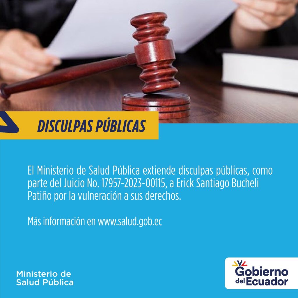 El Ministerio de Salud Pública extiende disculpas públicas, como parte del Juicio No. 17957-2023-00115, a Erick Santiago Bucheli Patiño por la vulneración a sus derechos.