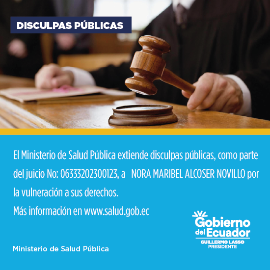 El Ministerio de Salud Pública extiende disculpas públicas, como parte del Juicio No. Juicio 06333202300123, a NORA MARIBEL ALCOSER NOVILLO por la vulneración a sus derechos.