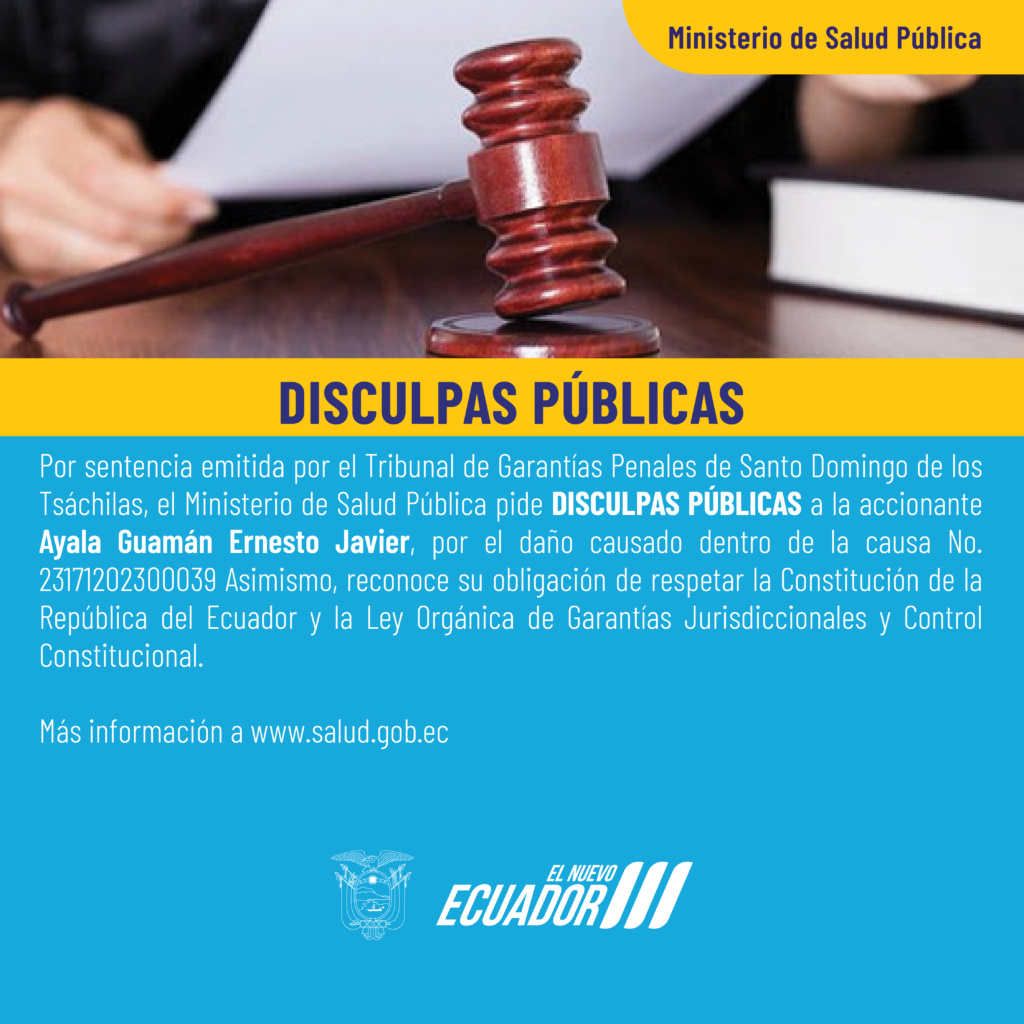 El Ministerio de Salud Pública extiende disculpas públicas en cumplimiento de la Acción de Protección 23171202300039, emitida por el Tribunal de Garantías Penales de Santo Domingo de los Tsáchilas