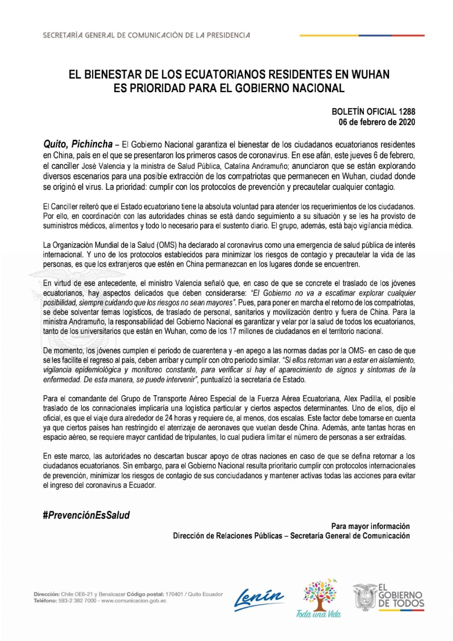 El bienestar de los Ecuatorianos Residentes en Wuhan es Prioridad para el Gobierno Nacional.