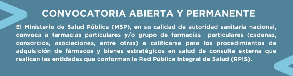 El Ministerio de Salud Pública convoca a las farmacias particulares y/o grupo de farmacias particulares (cadenas, consorcios, asociaciones, entre otras), a que manifiesten su interés de calificarse para participar en el PROCEDIMIENTO DE ADQUISICIÓN DE FÁRMACOS Y BIENES ESTRATÉGICOS EN SALUD DE CONSULTA EXTERNA QUE REALICEN LAS ENTIDADES QUE CONFORMAN LA RED PÚBLICA INTEGRAL DE SALUD –RPIS, DE ACUERDO AL ARTÍCULO 85 DEL REGLAMENTO DE LA LEY ORGANICA DEL SISTEMA NACIONAL DE CONTRATACIÓN PÚBLICA, reformado mediante Decreto Ejecutivo 378 del 22 de marzo de 2022, publicado en el Tercer Suplemento Nro 27 del Registro Oficial de 23 de marzo de 2022.