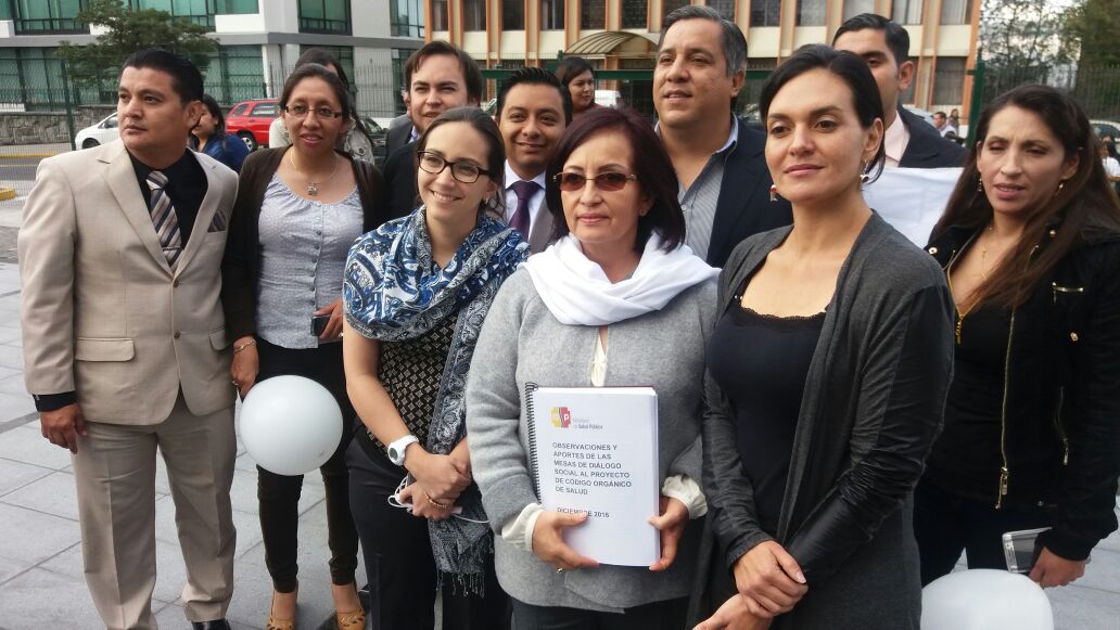 Tras una caminata que partió desde el Hospital Eugenio Espejo, en Quito, un grupo de profesionales de la salud encabezado por la ministra Margarita Guevara, llegó a la Asamblea Nacional para presentar los aportes al Código Orgánico de Salud (COS). El acto se desarrolló el martes 27 de diciembre de 2016, desde las 16:00.