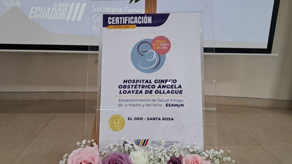 El Hospital Obstétrico Ángela Loayza de Ollague, ubicado en Santa Rosa, provincia de El Oro, recibió la Certificación como Establecimiento Amigo de la Madre y el Niño (ESAMyN), con una calificación de 92.21 puntos, reconocimiento que ratifica su compromiso con la salud materna y neonatal, la calidad de los servicios y la atención humanizada.