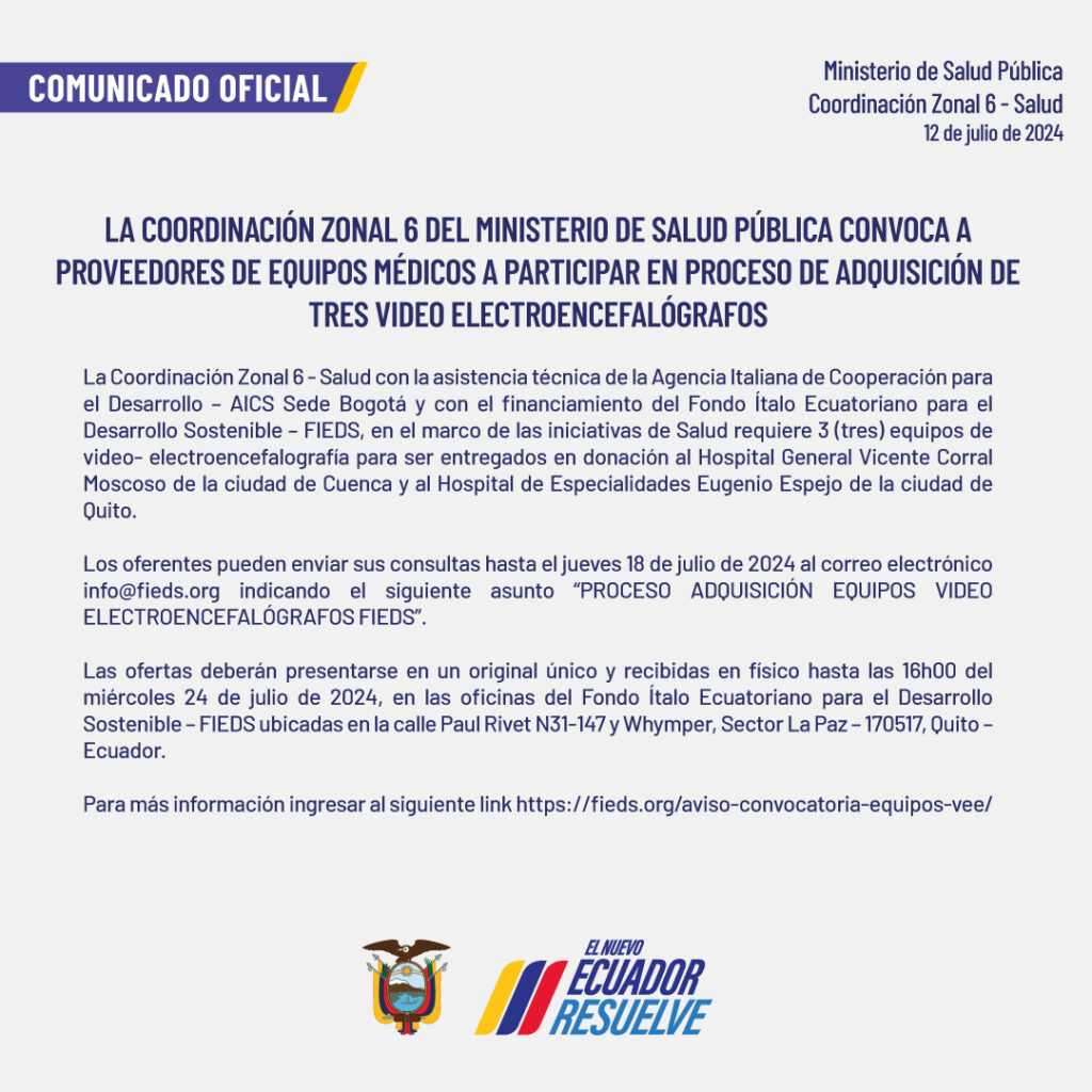 La Coordinación Zonal 6 del Ministerio de Salud Pública convoca a proveedores de equipos médicos a participar en proceso de adquisición de ¨TRES VIDEO ELECTROENCEFALÓGRAFOS¨.