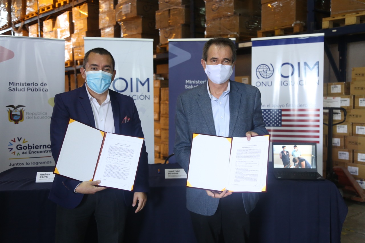 Los insumos fueron recibidos el jueves 22 de julio, por el subsecretario de Provisión de Servicios de Salud, Andrés Corral, mientras que la entrega oficial estuvo a cargo del jefe de Misión de OIM, en Ecuador, José Iván Dávalos.
